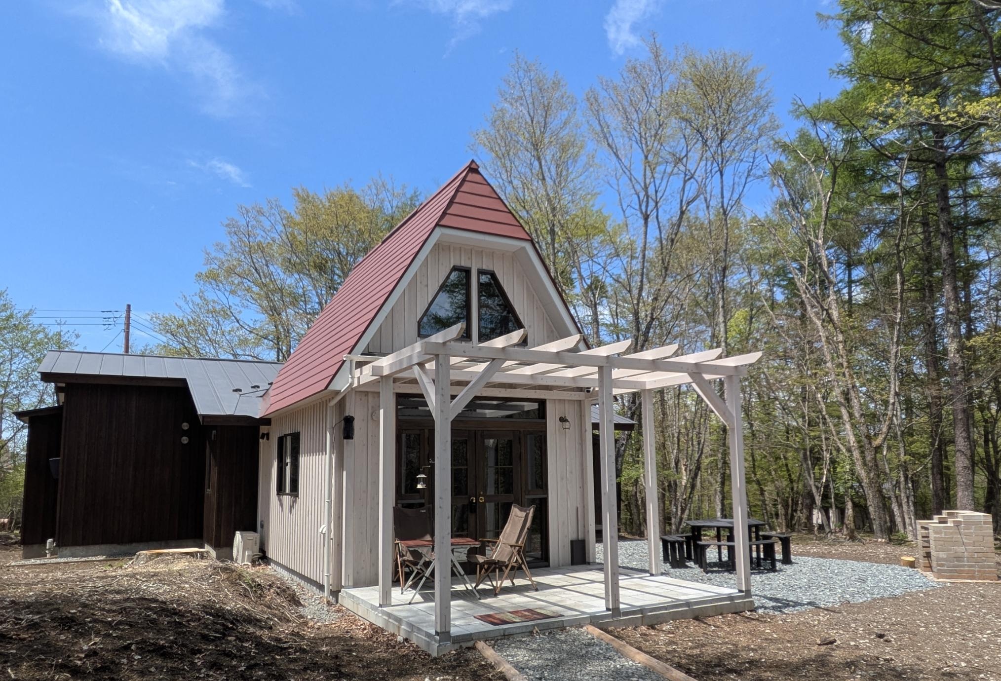 約1,000㎡の広い敷地に佇む赤い三角屋根の平屋建築。BBQのできる完全プライベート空間